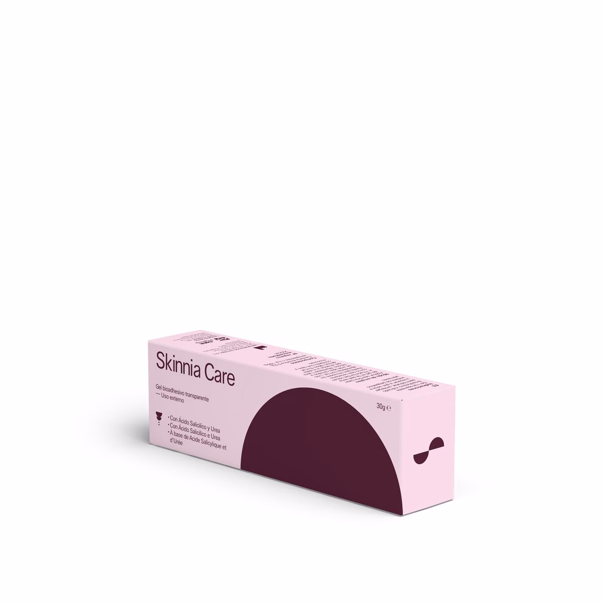 El Apósito protector Skinnia Care Gel 30 g está diseñado para reparar zonas cutáneas engrosadas o deterioradas, como almohadillas o puntos de presión. Su fórmula combina ácido salicílico 2 % y urea 2 % rodeados de una matriz que forma una película transparente y bioadhesiva que permanece hasta 8 horas, permitiendo ver la zona tratada.