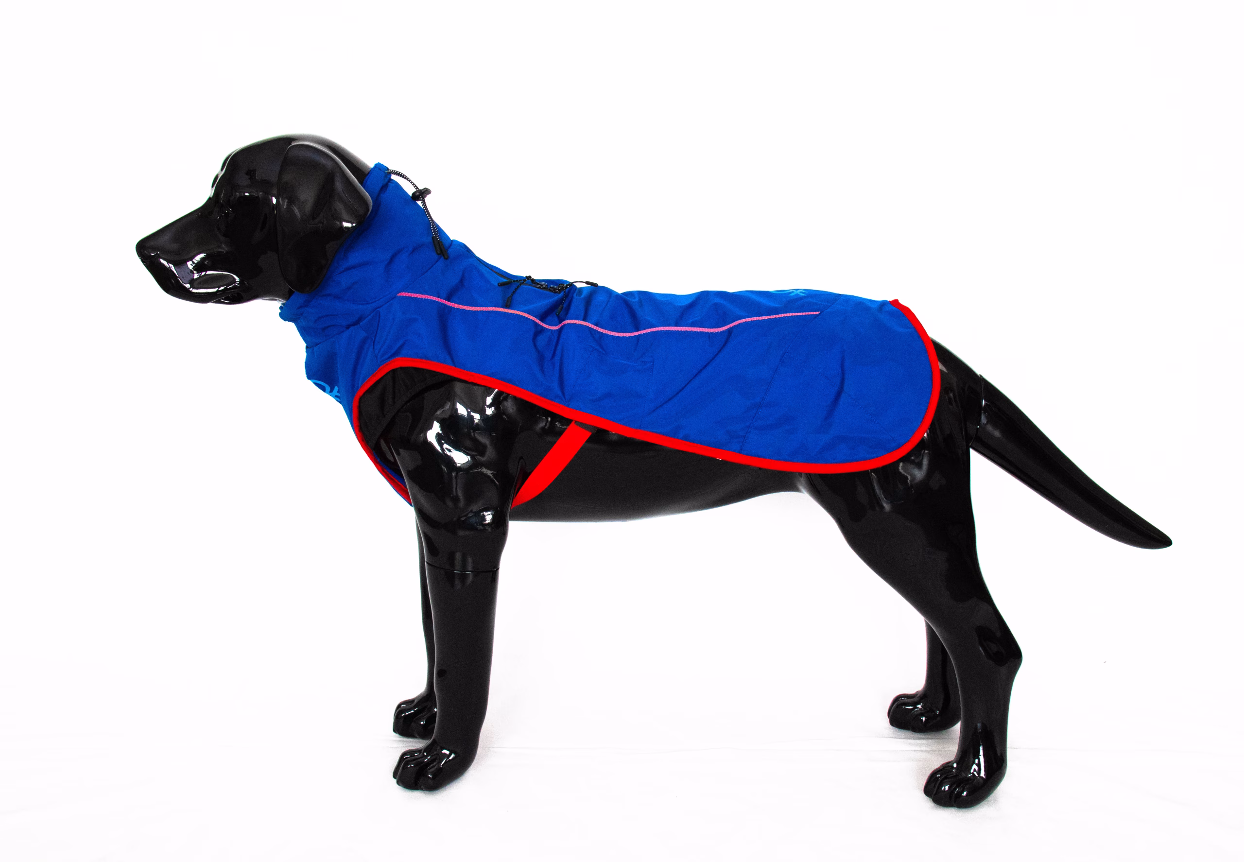 Disponible en varios tonos como rojo, azul, naranja y negro, todos con acabado moderno, botones o ribetes contrastados. Los colores permiten adaptar el abrigo al estilo del perro o del ambiente.