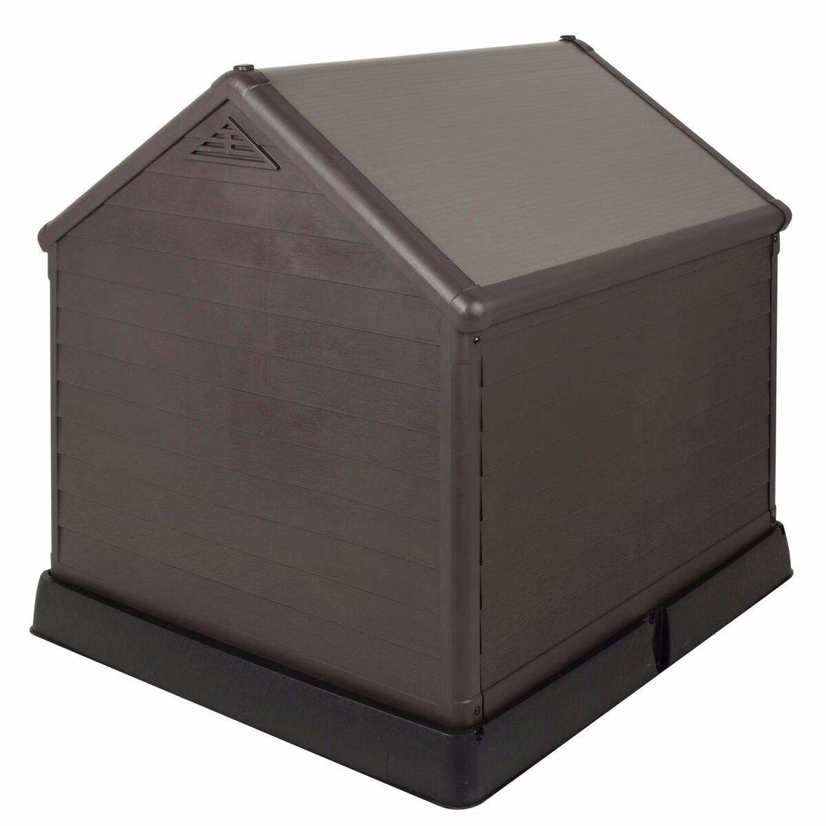 El techo inclinado facilita la evacuación del agua de lluvia, mientras que las superficies lisas permiten una limpieza rápida y cómoda. Su color marrón permite que se integre con jardines, terrazas o espacios exteriores sin desentonar.