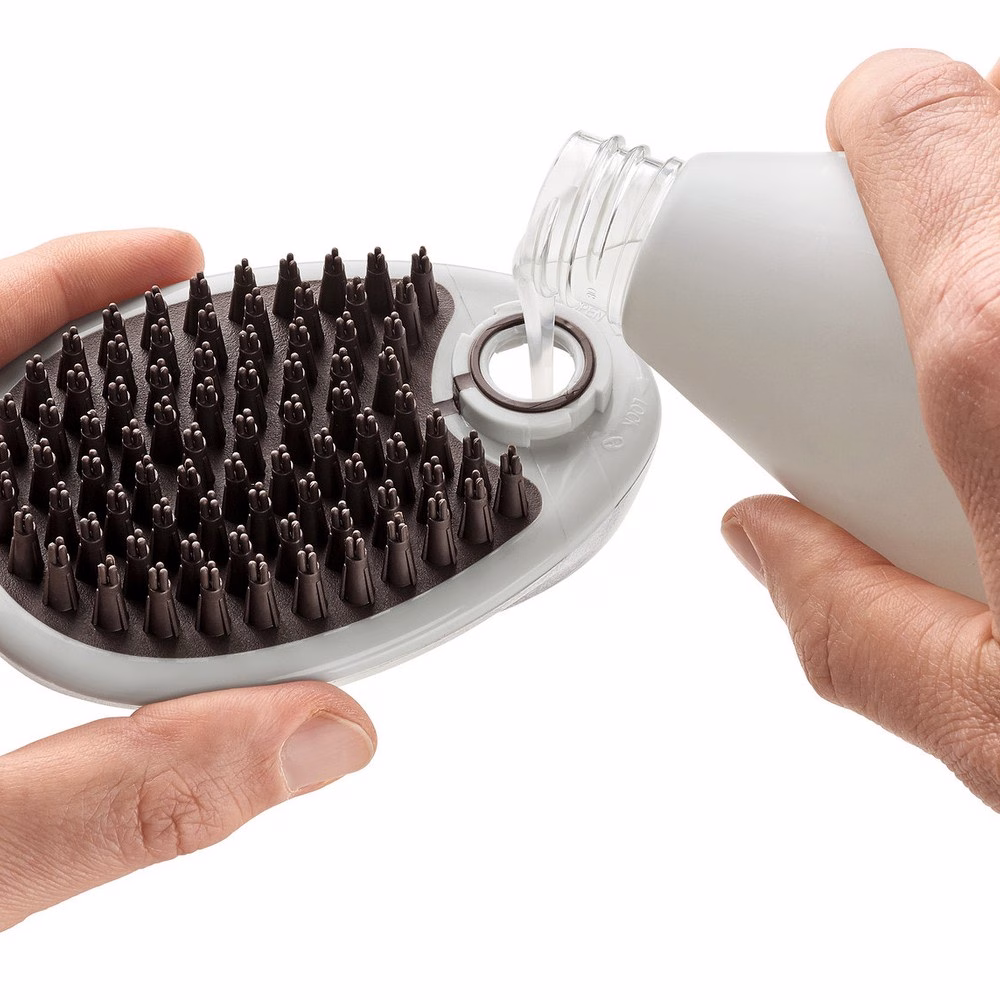 El Curry Comb Spa de Hunter es una herramienta innovadora que combina cepillado, lavado y masaje en un solo gesto. Con su función integrada de champú, puedes rellenarlo con tu producto habitual y dosificarlo directamente sobre el pelaje durante el cepillado.