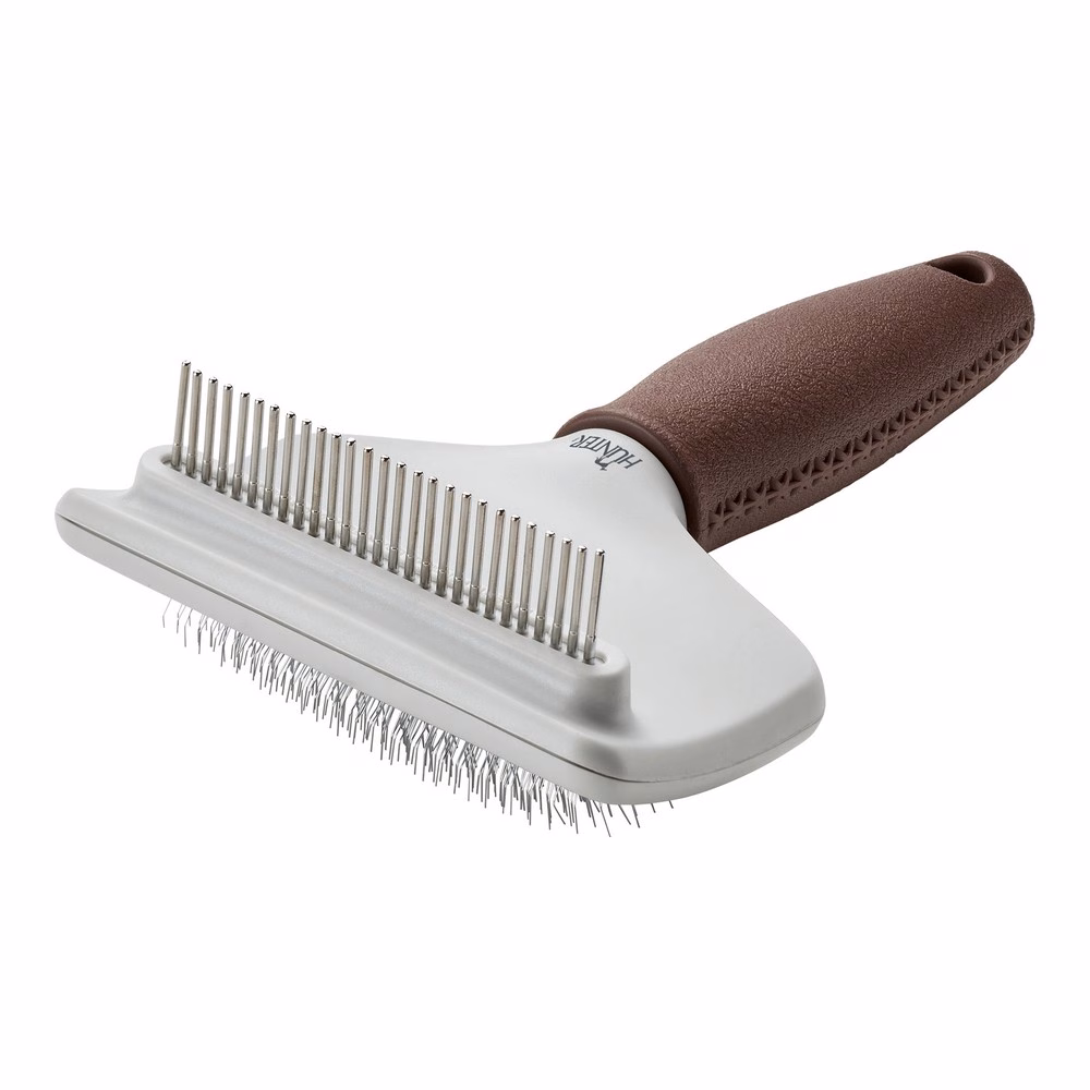 ¡Dos cuidados en una sola herramienta! El Cepillo Spa Multifunción Hunter, en S (18 x 9,5 cm), M (20 x 11 cm) y L (21 x 12 cm), permite arrancar pelo muerto y peinar con suavidad en un solo gesto. ¡Practicidad, calidad y bienestar premium para tu perro!