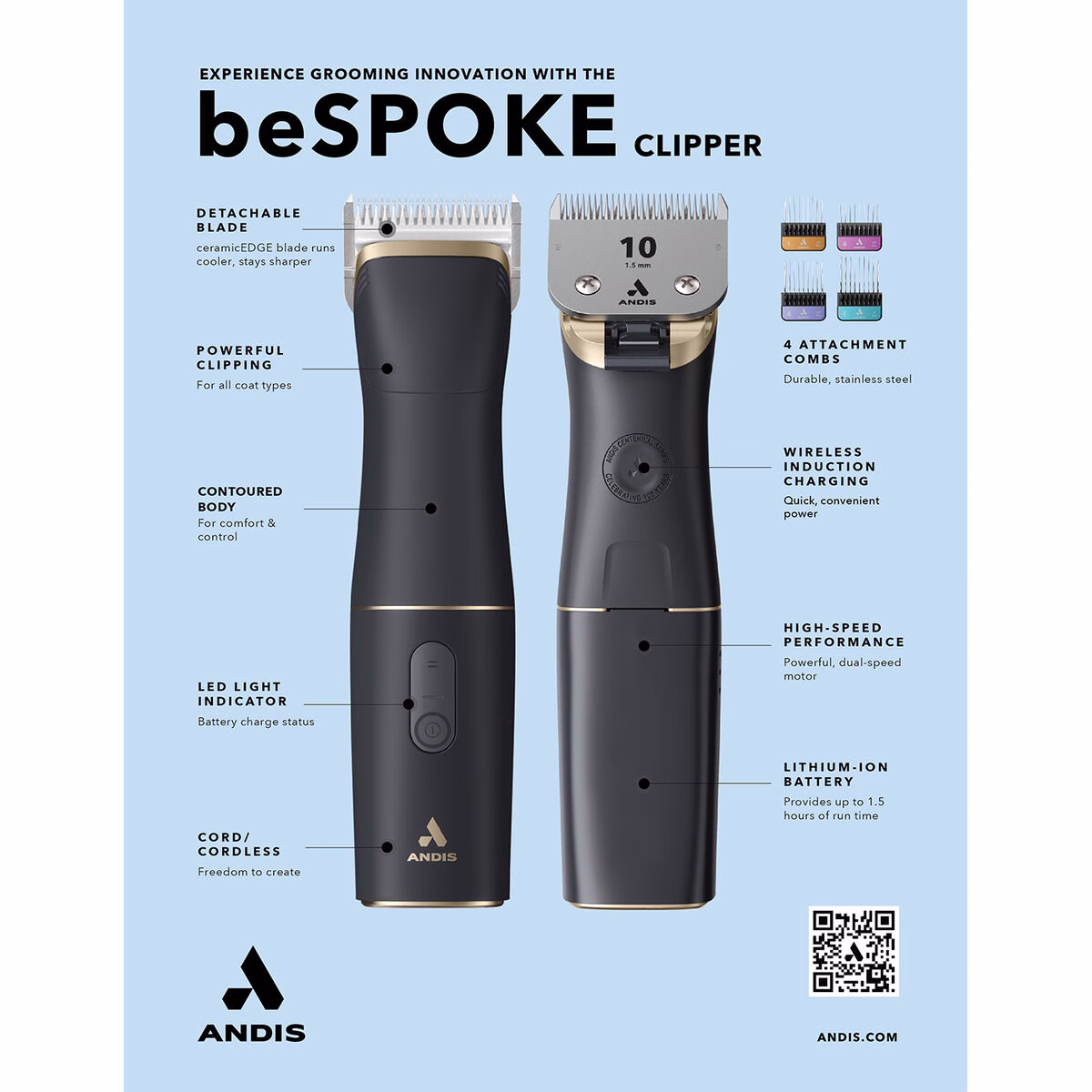 El Cortapelos Andis beSPOKE ofrece un rendimiento inalámbrico profesional con motor rotatorio de 2 velocidades, carga por inducción y diseño antipérdida de agarre para sesiones prolongadas.