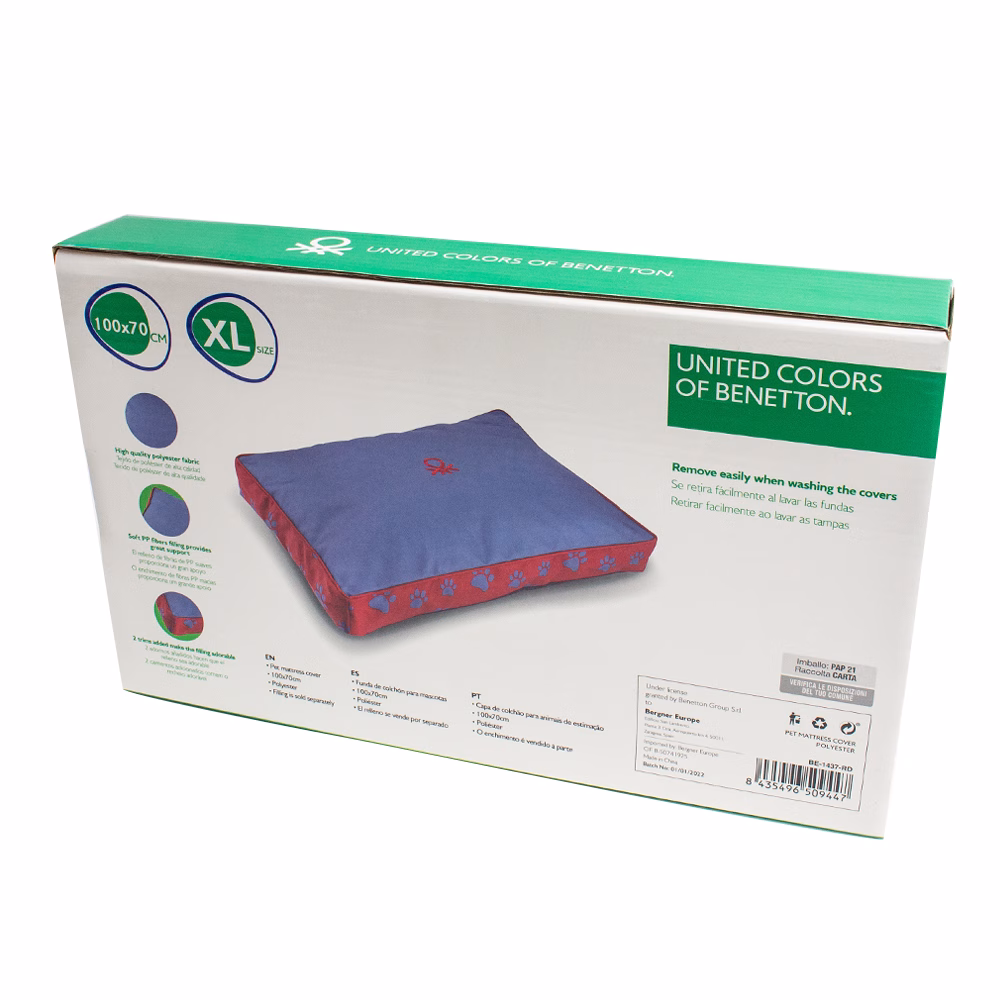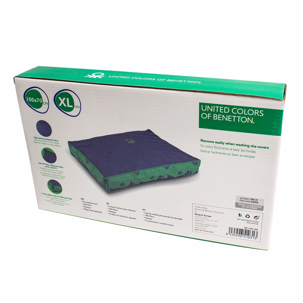 Funda Colchón Huellas Benetton diseñada para dotar de estilo y confort el lugar de descanso de tu mascota. Esta funda desenfundable presenta un estampado de huellas moderno y divertido, fabricada para durar y facilitar la limpieza, adaptándose a distintas tallas de colchón.
