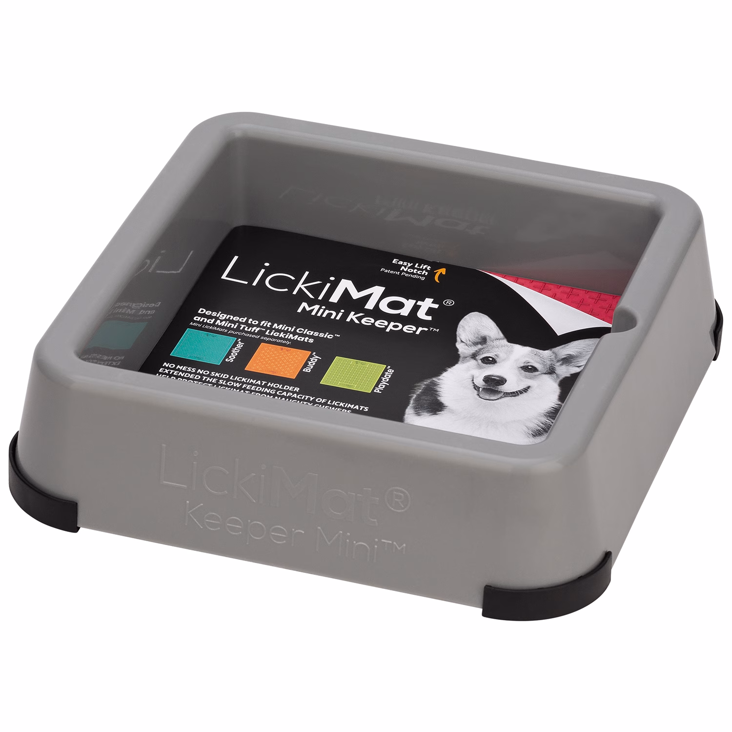 Soporte LickiMat Mini Keeper en colores verde, turquesa, naranja o gris. Fija la alfombrilla, evita deslizamientos y mejora la experiencia de lamido.