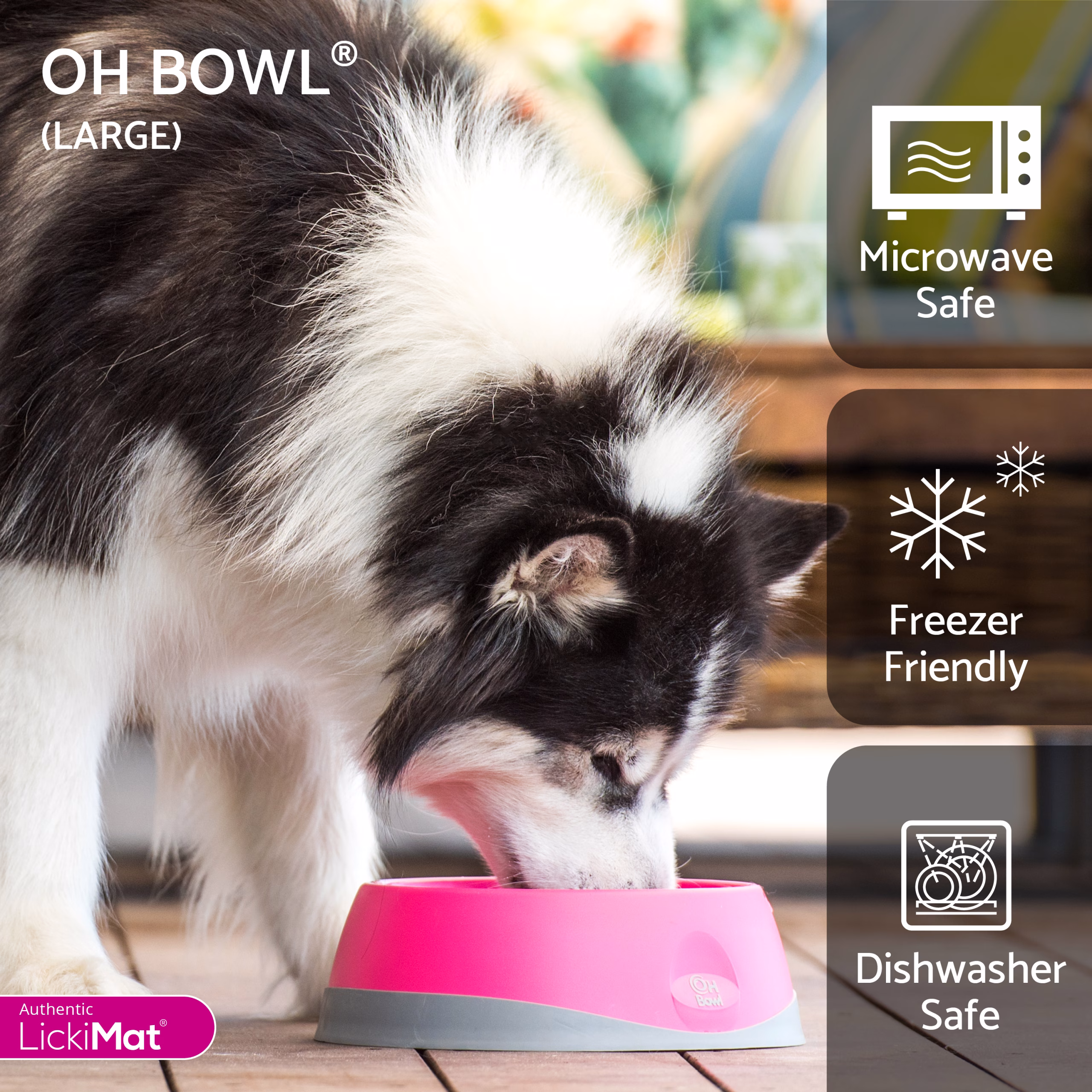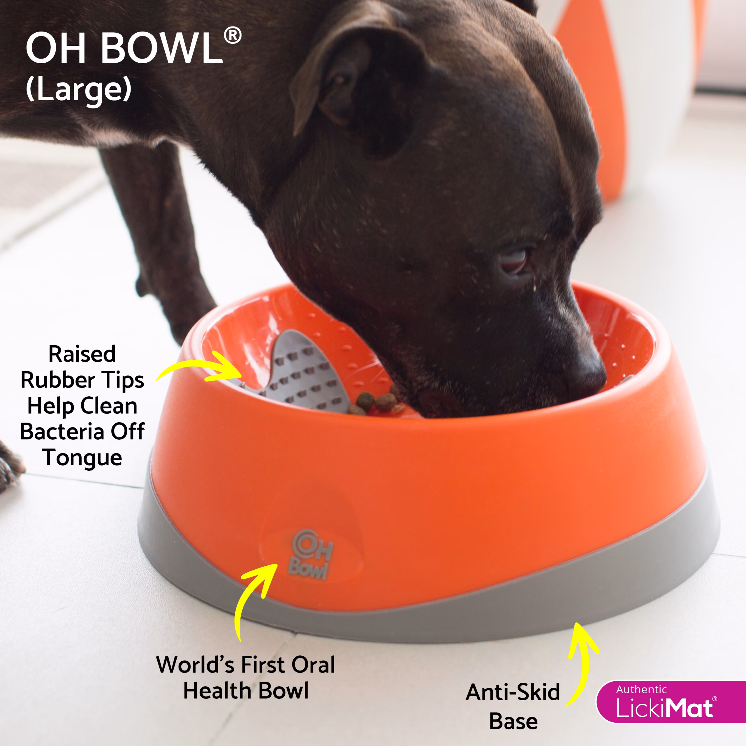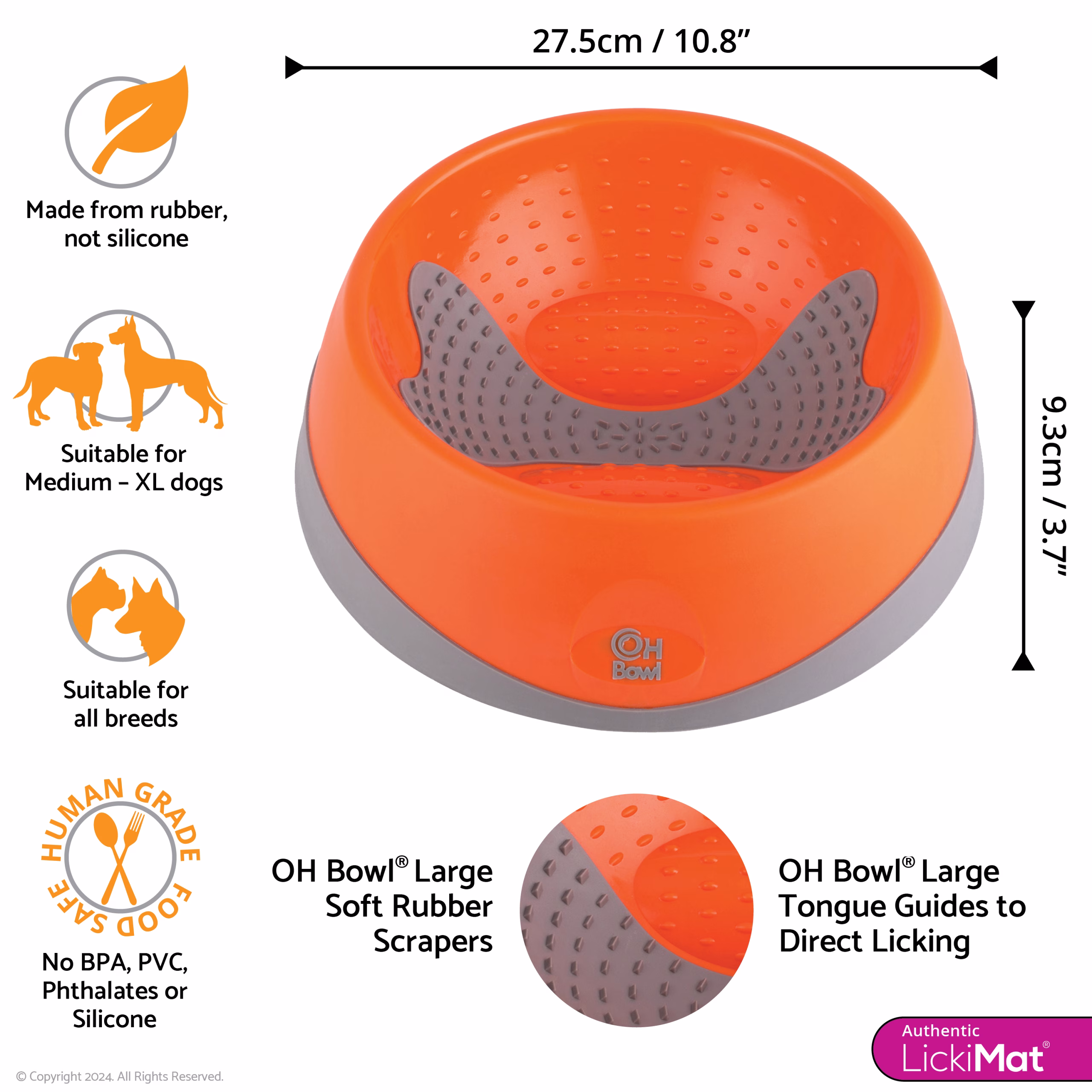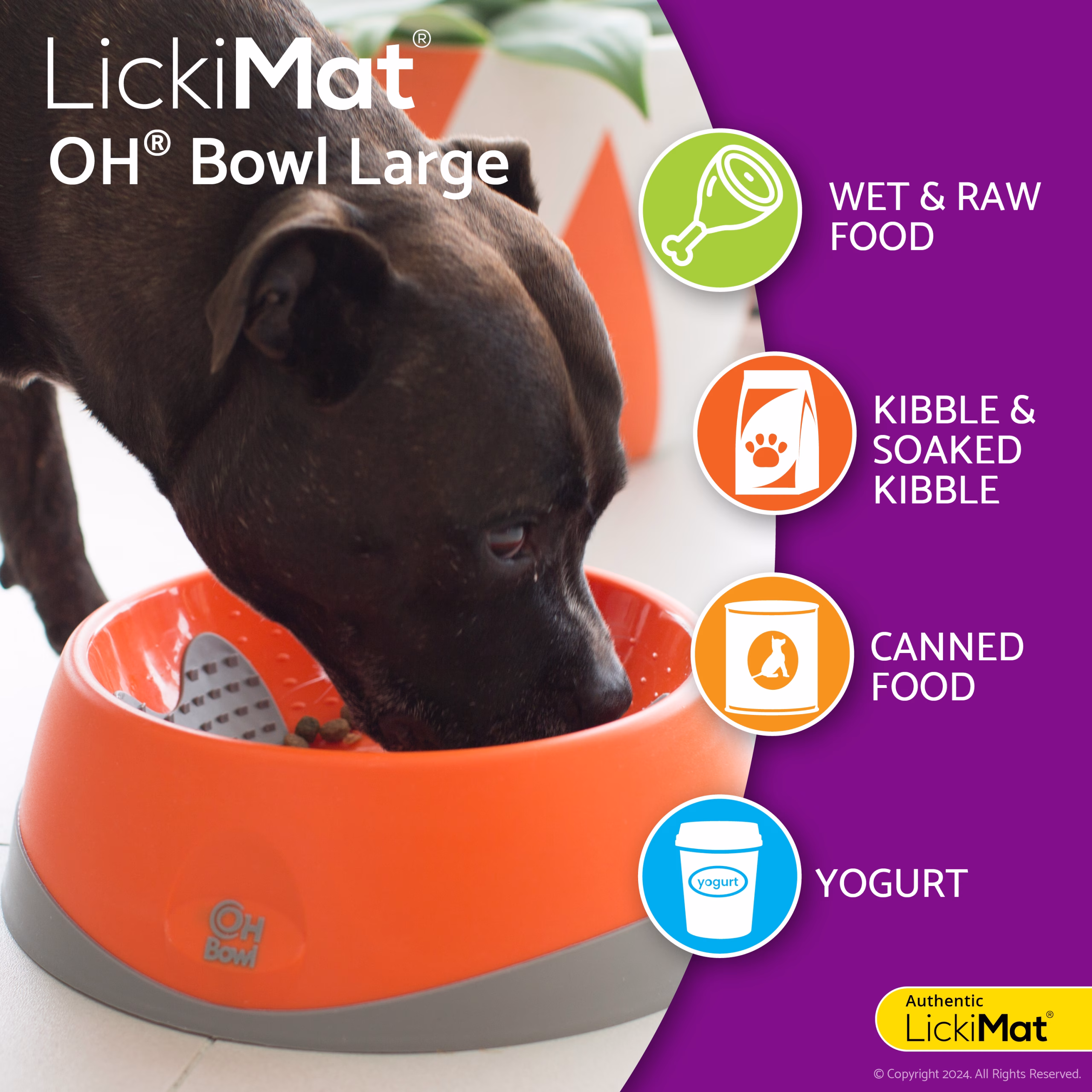 Cuenco LickiMat OH Bowl Large en colores verde o naranja. Ideal para limpieza de lengua, alimentación lenta y bienestar en razas grandes.