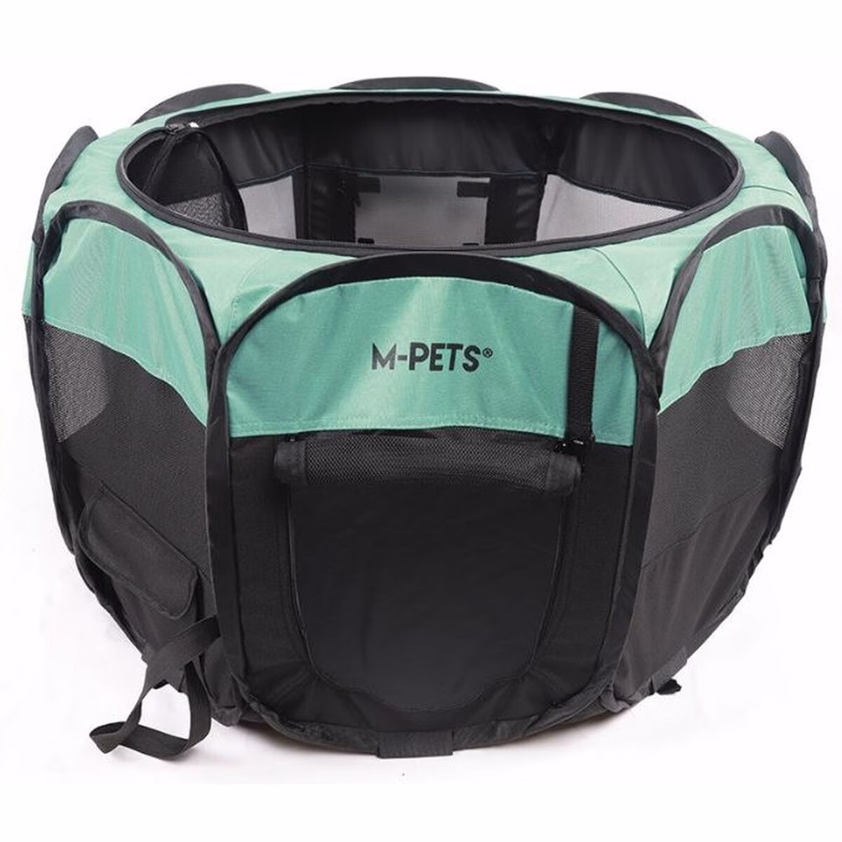 El OCTAGON Puppy Pen negro-verde de Mpets es un parque plegable ideal para cachorros. Con techo removible, puerta enrollable, 8 ventanas, cremalleras reforzadas y uso interior/exterior.