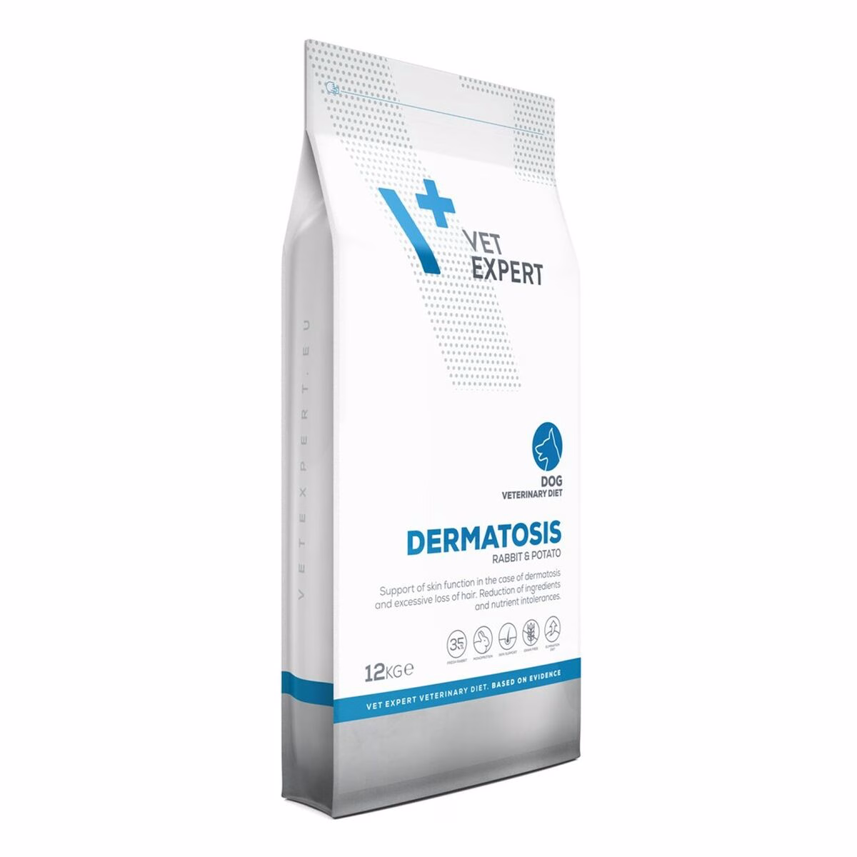 VetExpert Dermatosis Rabbit & Potato 12 kg es una dieta veterinaria para perros con reacciones alimentarias de origen cutáneo. Incluye como fuente de proteína única el conejo y carbohidratos hipoalergénicos como patata, además de omega-3, para fortalecer la barrera dérmica.