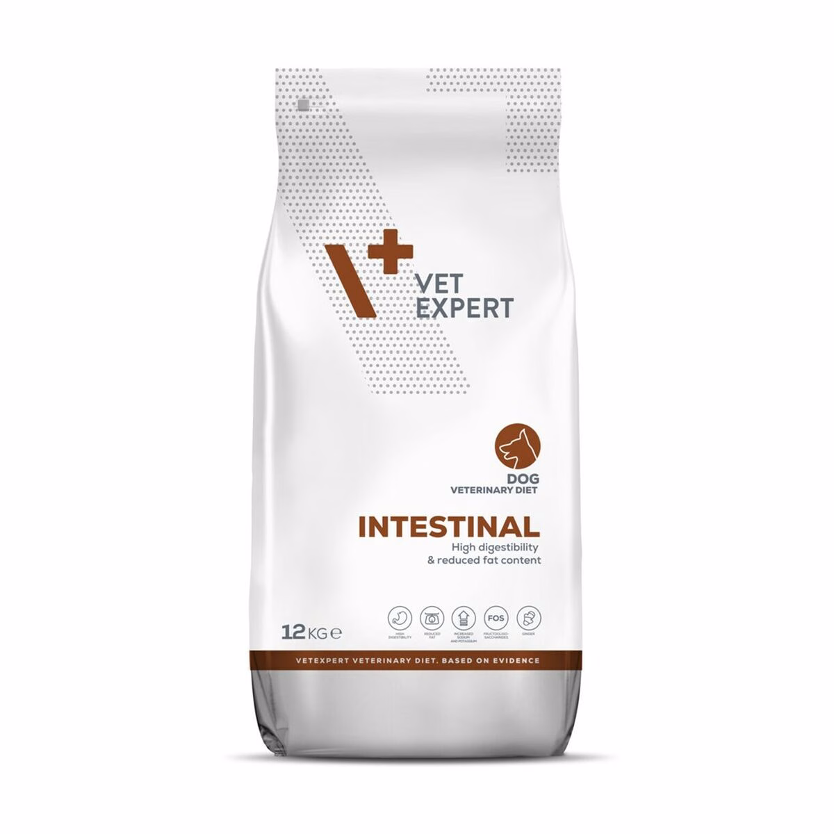 El pienso VetExpert Intestinal Dry 12 kg es una dieta veterinaria de mantenimiento para perros adultos con sensibilidad digestiva. Proteína única de pavo, fibras prebióticas (FOS/MOS), jengibre y bajo contenido graso para una digestión eficaz.
